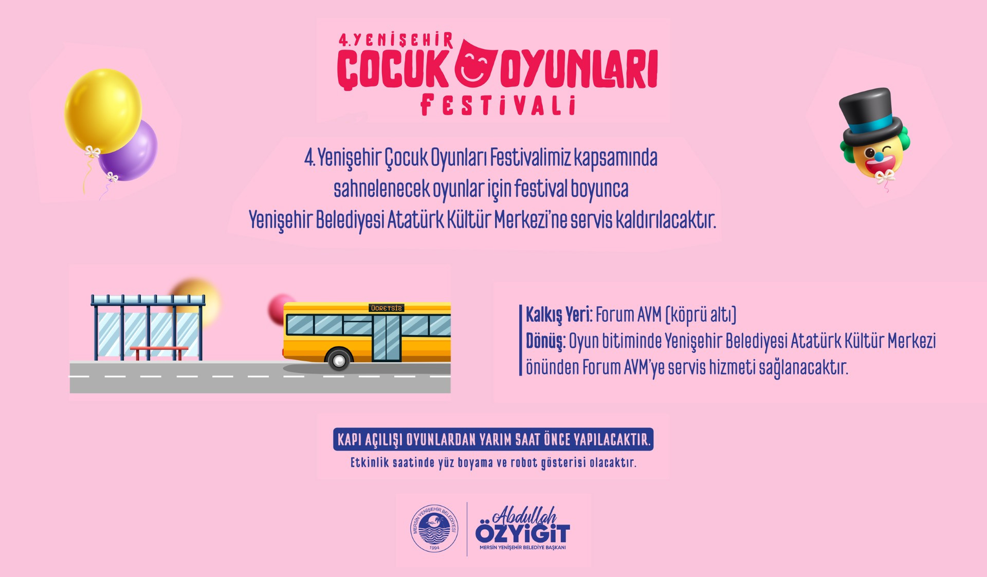 Festival kapsamında sahnelenecek oyunlar için ücretsiz servis hizmeti de verilecek. Servisler, oyun saatinden bir saat önce Forum AVM (köprü altı) kalkış noktasından hareket edecek. Oyun bitiminde ise Yenişehir Belediyesi Atatürk Kültür Merkezi önünden Forum AVM’ye dönüş servisleri sağlanacak.