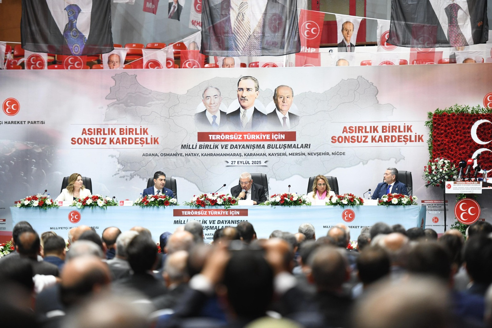 Milliyetçi Hareket Partisi’nin öncülüğünde gerçekleştirilen “Asırlık Birlik, Sonsuz Kardeşlik” temalı “Terörsüz Türkiye İçin Millî Birlik ve Dayanışma Buluşmaları” kapsamında son toplantı, Adana’da yapıldı. Adnan Menderes Kapalı Spor Salonu’nu dolduran partililer ve vatandaşlar, birlik ve beraberlik mesajlarına güçlü destek verdi. Milliyetçi Hareket Partisi Mersin Milletvekili ve MYK Üyesi Dr. Levent Uysal terörsüz Türkiye hedefine emin adımlarla ilerlediklerini kaydederek “Terörsüz Türkiye çağrısı bir olma çağrısıdır.” şeklinde konuştu.