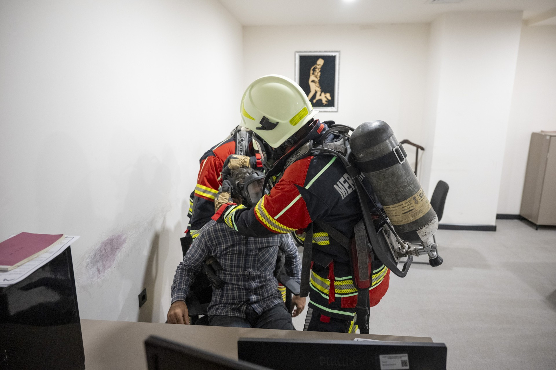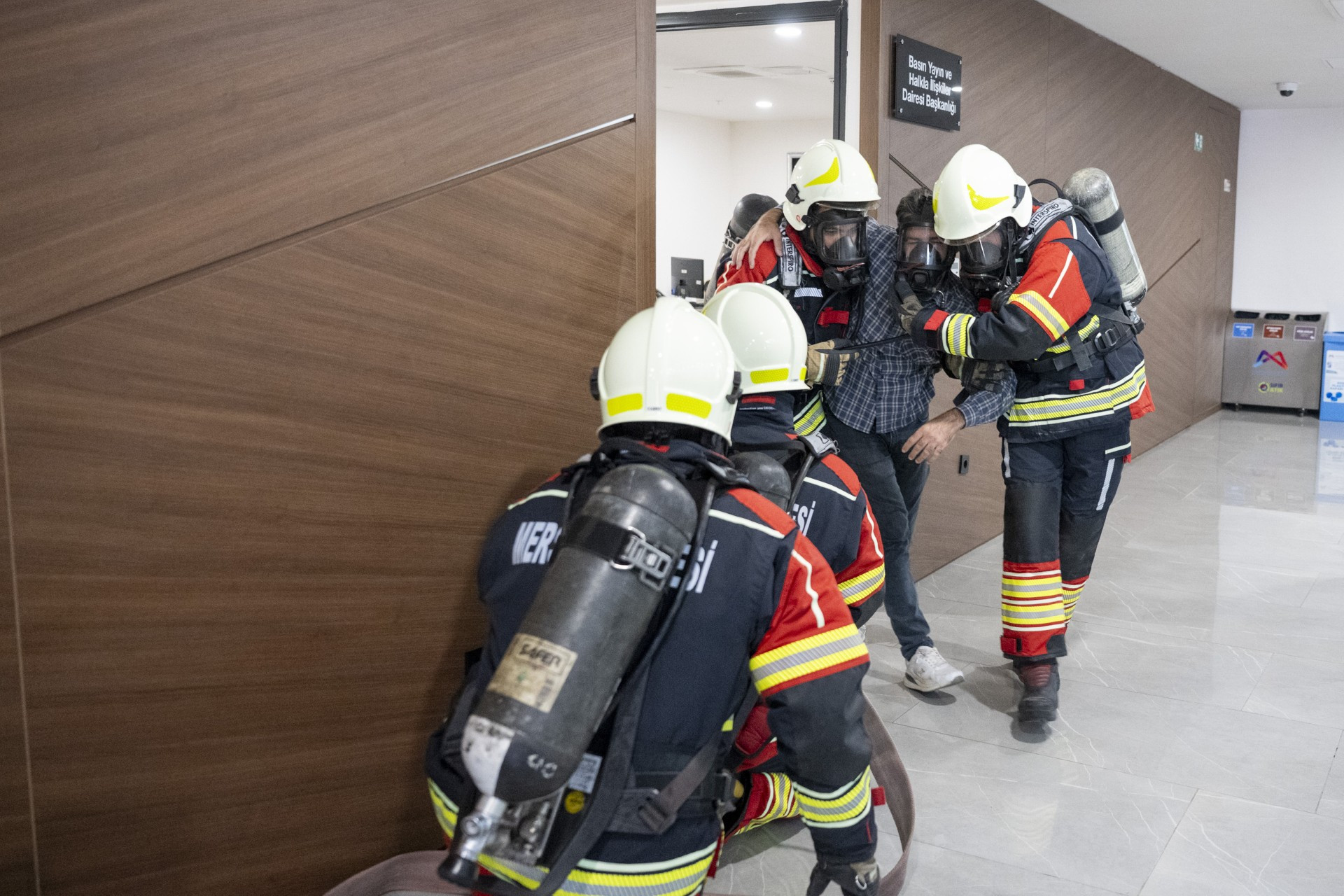 Birimlerin kendi aralarında personel yoklamalarını yaptığını ve yoklamalarda bir kişinin senaryo gereği alt katta mahsur kaldığı ve zehirli gazlardan etkilendiğinin gözlemlendiğini aktaran Çavdar, “‘Binaların yangından korunması’ yönetmeliği gereği binada bulunan kurtarma ve ilk yardım ekibindeki arkadaşlar; yangına ve dumana maruz kalan yaralı personelin koordinatlarını itfaiye ekiplerine bildirdi. İtfaiye ekipleri, solunum setleri ve tam teçhizatlı olarak içeriye girdiler. Zehirli gaza maruz kalan kişiye maske takarak, dışarıya tahliyesini gerçekleştirdiler” diye konuştu.