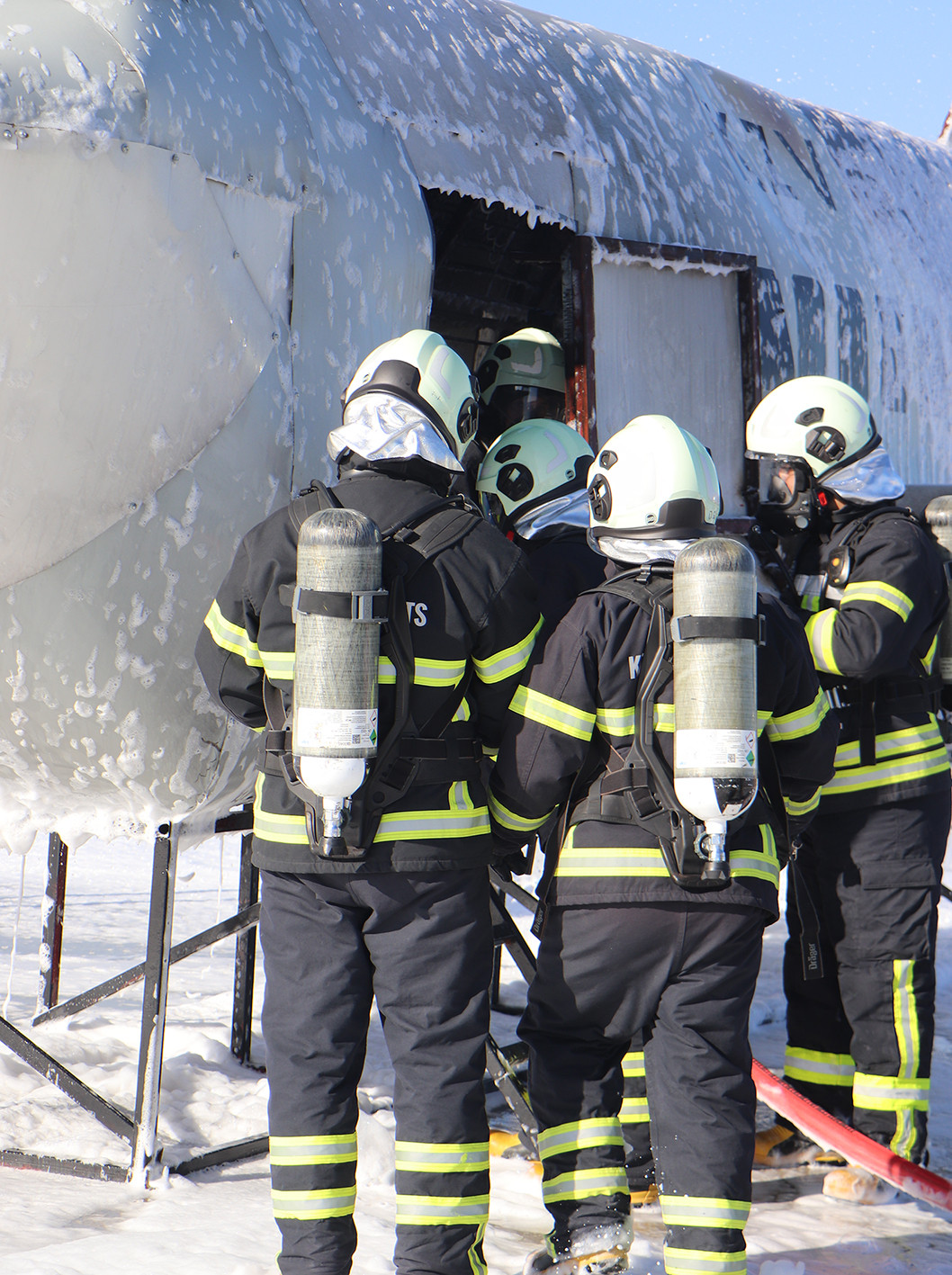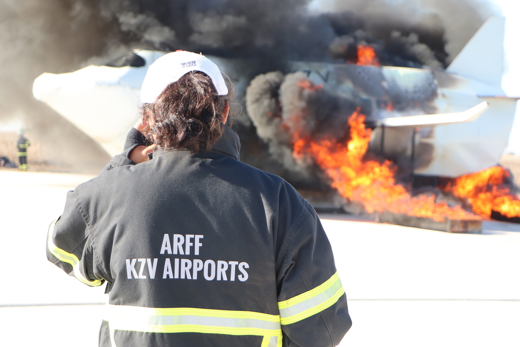 Alarm durumuna geçen Havalimanı Kurtarma ve Yangınla Mücadele (ARFF) ekipleri, kısa sürede olay yerine ulaştı. ARFF ekip liderinin ilk değerlendirmesinde, rüzgârın 21 pist yönünden 5 knot kuvvetinde estiği, uçağın sağ kanadının yanmakta olduğu ve mürettebatın kapıyı açarak acil tahliye slaydını aktif ettiği belirlendi. Yolcular slayt üzerinden tahliye edilirken yaralıların olduğu, ayrıca uçak içinde mahsur kalan yolcu ve mürettebatın bulunduğu senaryo gereği tespit edildi.