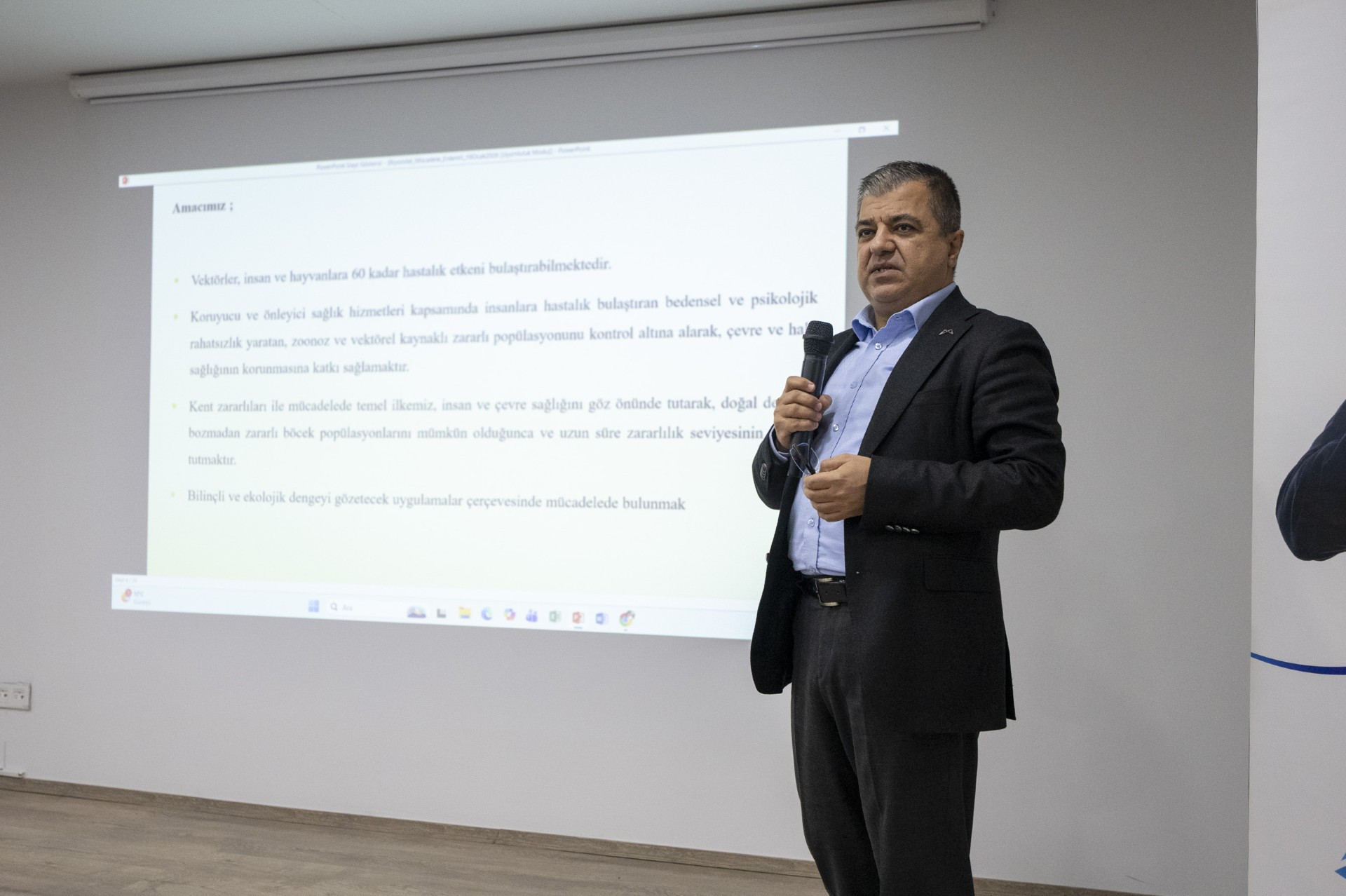 Çevre Koruma ve Kontrol Dairesi Başkanı Dr. Bülent Halisdemir’in kapsamlı bir sunum yaptığı toplantıda, Mersin genelinde yürütülen vektörel mücadele çalışmaları hakkında önemli bilgiler paylaşıldı. Kentin coğrafi yapısı, yüksek nem oranı ve tarımsal üretim yoğunluğu nedeniyle, özellikle sivrisinek başta olmak üzere haşerelerin kolaylıkla üreyebildiğine dikkat çekildi. Bu nedenle mücadelenin yalnızca ilaçlama ile değil; kültürel, fiziksel ve biyolojik yöntemlerle kaynağında yapılmasının önemine vurgu yapıldı.