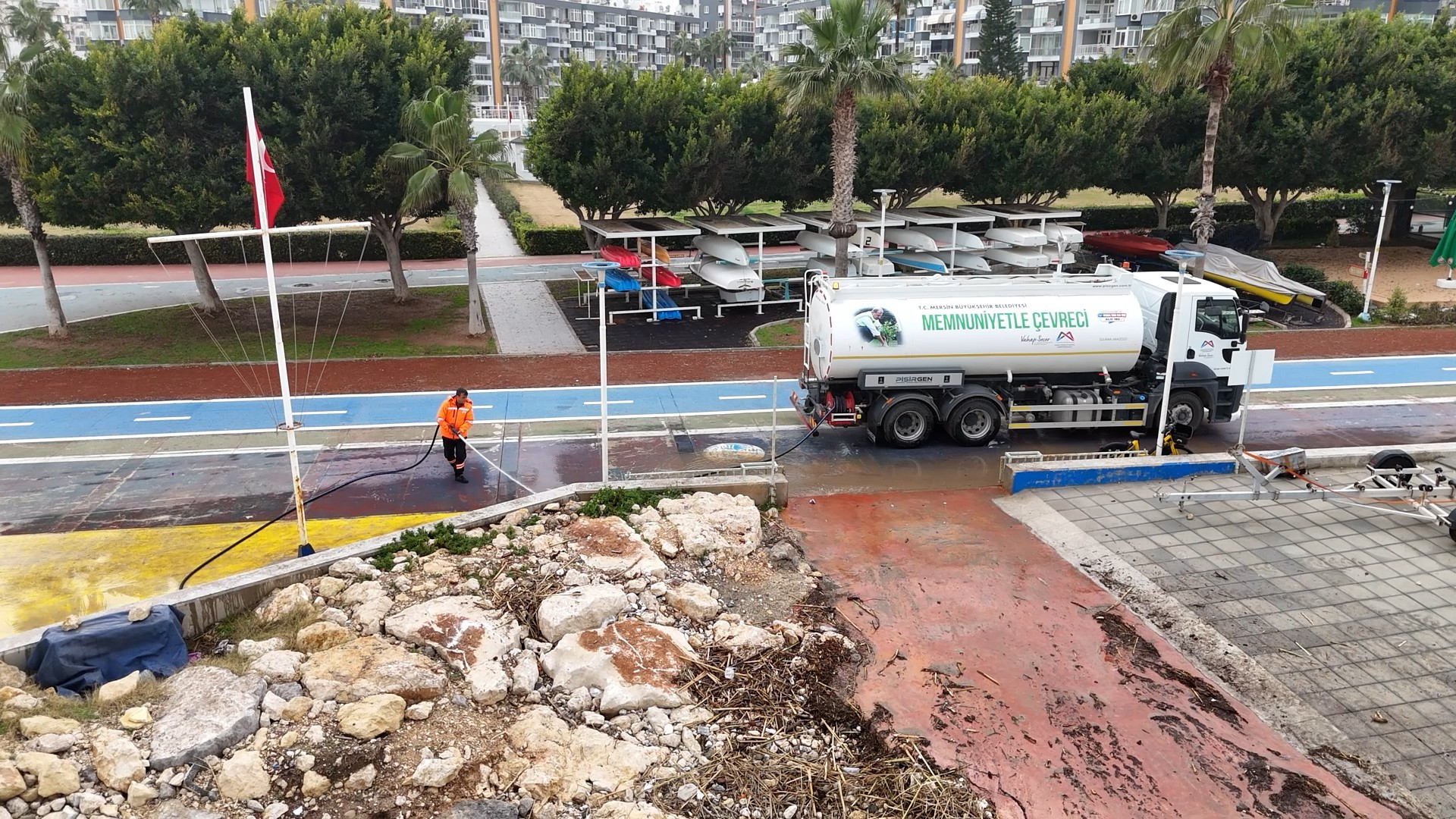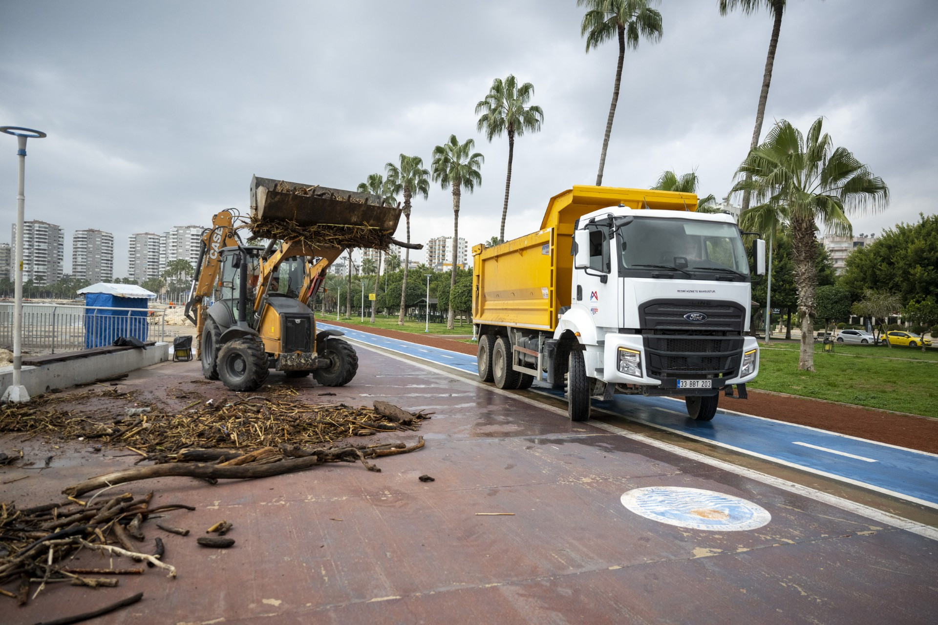 Mezitli ilçesi Tece sahili ile Akdeniz ilçesi Kazanlı sahili arasını kapsayan bölgede sel sularının sürüklediği odun, çakıl ve süprüntü atıkları, Büyükşehir ekiplerinin koordineli çalışmasıyla temizleniyor. Öte yandan Adnan Menderes Bulvarı Kültür Park ve çevresinde de taşkınlar sonrası yüzey akıntısı ile denize ulaşan atıkların temizliği yapılırken, kuvvetli yağışlar nedeniyle tahrip olan yerlerde ise yenileme çalışmaları süratle devam ediyor.