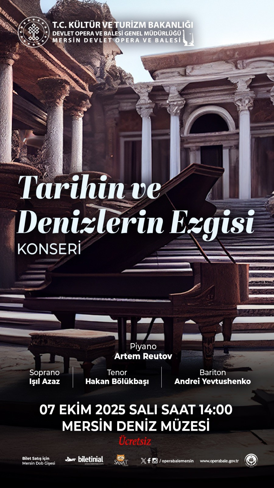 Geleneksel hale gelen Müzesi Konserleri kapsamında, 7 Ekim 2025 Salı günü Mersin Deniz Müzesi’nde saat 14:00’te ve 8 Ekim 2025 Çarşamba günü Tarsus Müzesi’nde saat 14:00’te “Tarihin ve Denizlerin Ezgisi” adlı ücretsiz konserler gerçekleştirecek.