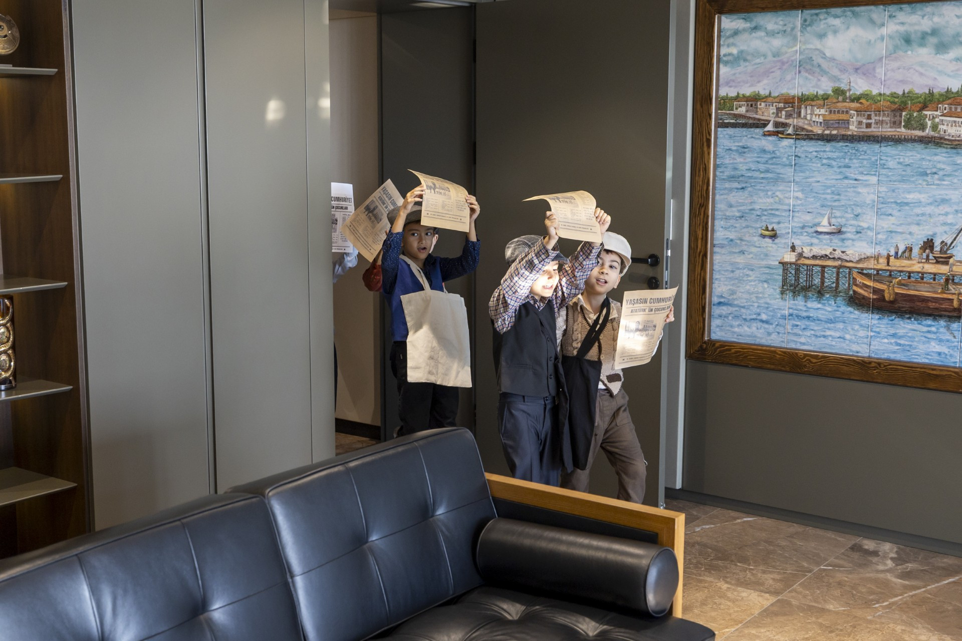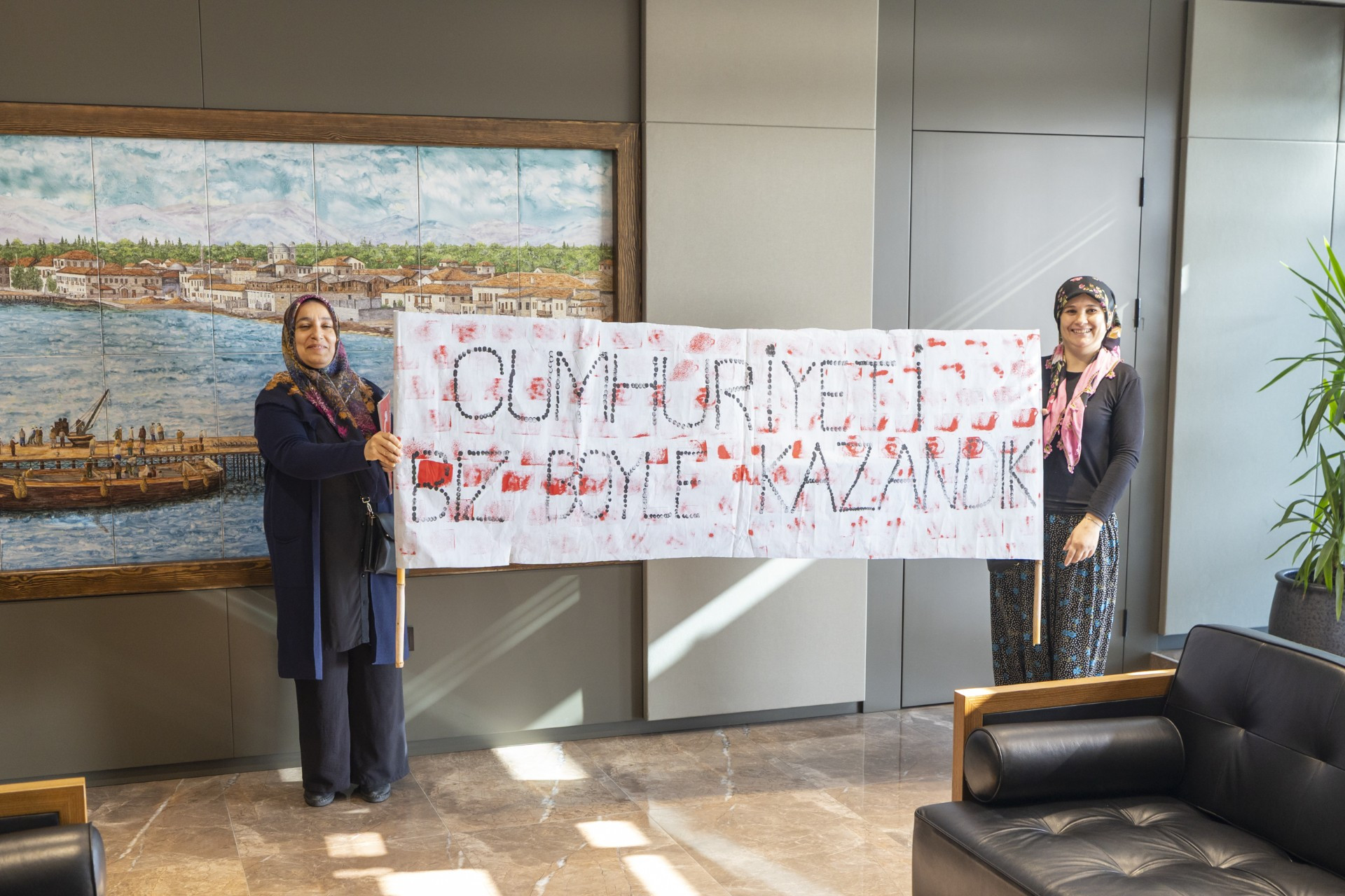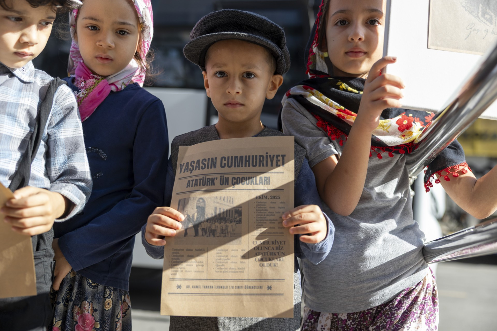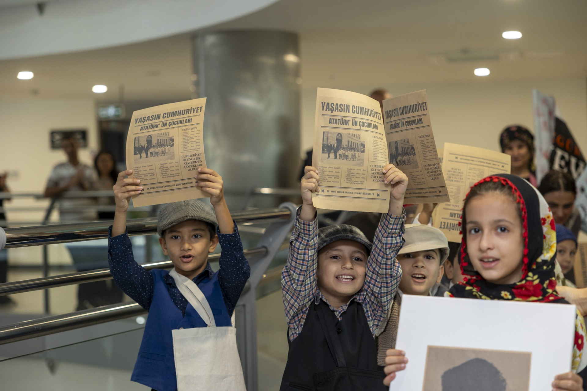 Yöresel ve dönemsel kıyafetlerle Mersin Büyükşehir Belediyesi Hizmet Binası’na gelen minik öğrenciler, ellerinde Atatürk posterleri ve temsili gazete nüshalarıyla ‘Yazıyor, yazıyor! Cumhuriyet ilan edildi!’ nidaları eşliğinde binaya giriş yaptı. Büyük bir coşkuyla Cumhuriyet’in ilanını anımsatan öğrenciler, kendi hazırladıkları ‘Cumhuriyet ilan edildi’ temalı nostaljik gazeteleri belediye personeli ile paylaştı. Minikler, ziyaretin sonunda Başkan Seçer’e de içeriğini kendi hazırlamış oldukları gazeteyi takdim etti. Öte yandan veliler ise atıl durumdaki bir pankartı yeniden düzenleyip, üzerine “Cumhuriyeti Biz Böyle Kazandık” yazısını ekleyerek görüşmeye katıldı.