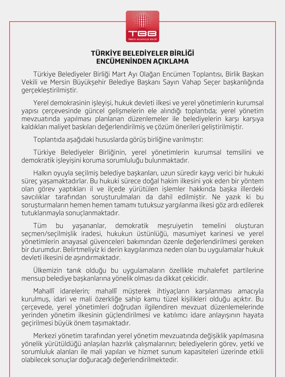 Türkiye Belediyeler Birliği Encümeni, Birlik Başkan Vekili ve Mersin Büyükşehir Belediye Başkanı Vahap Seçer başkanlığında Ankara’da gerçekleştirilen Mart Ayı Olağan Encümen Toplantısı’nın ardından yazılı açıklama yaptı.