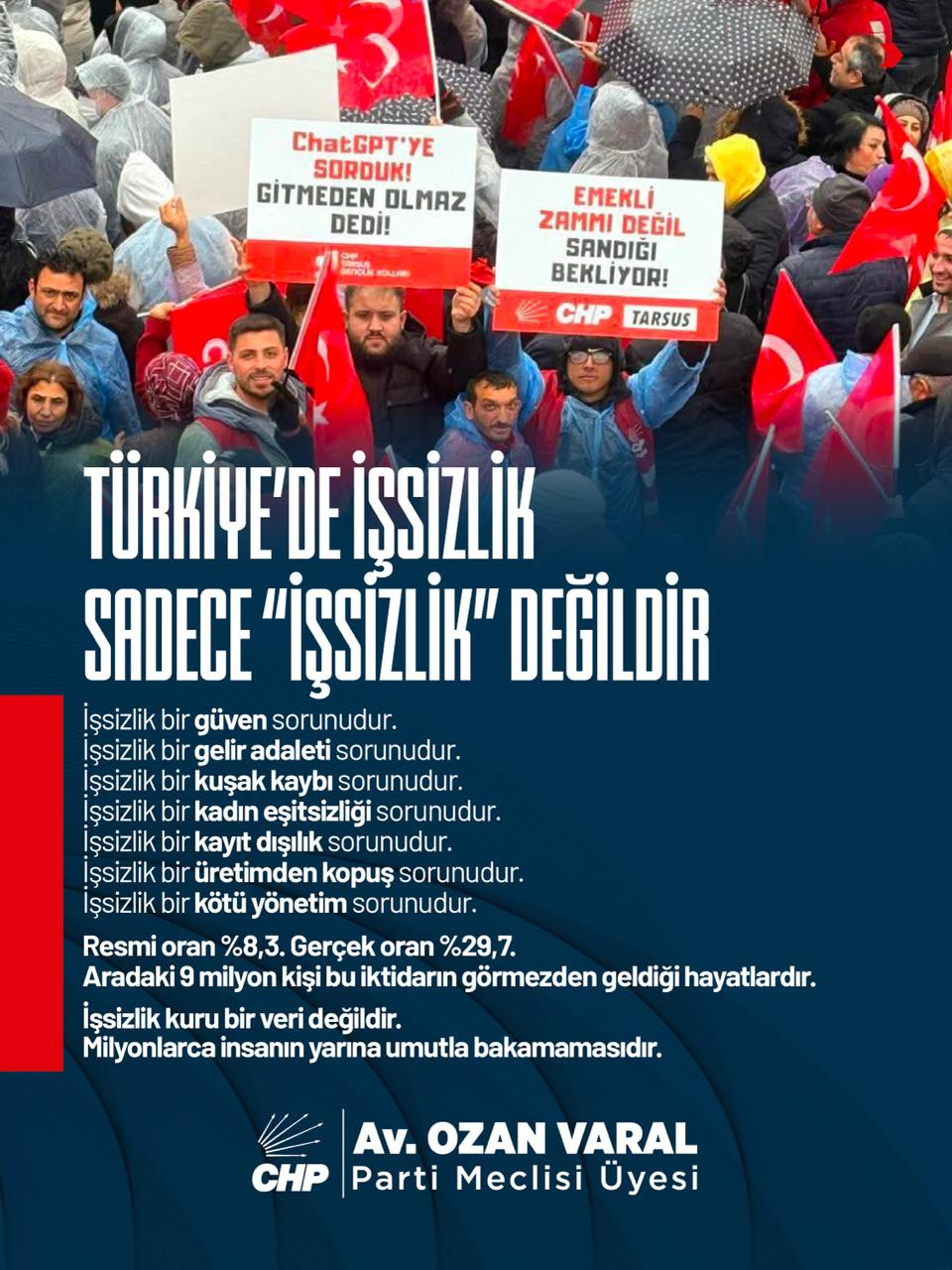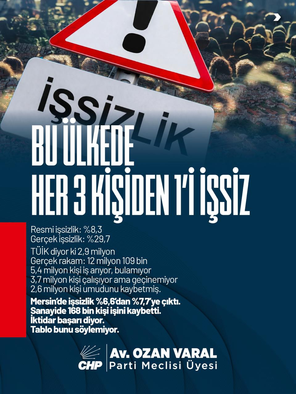 “Türkiye’de işsizlik sadece “işsizlik” değildir” diyen CHP PM Üyesi Ozan Varal, “İşsizlik bir güven sorunudur. İşsizlik bir gelir adaleti sorunudur. İşsizlik bir kuşak kaybı sorunudur. İşsizlik bir kadın eşitsizliği sorunudur. İşsizlik bir kayıt dışılık sorunudur. İşsizlik bir üretimden kopuş sorunudur. İşsizlik bir kötü yönetim sorunudur. Resmi oran yüzde 8,3. Gerçek oran yüzde 29,7. Aradaki 9 milyon kişi bu iktidarın görmezden geldiği hayatlardır.