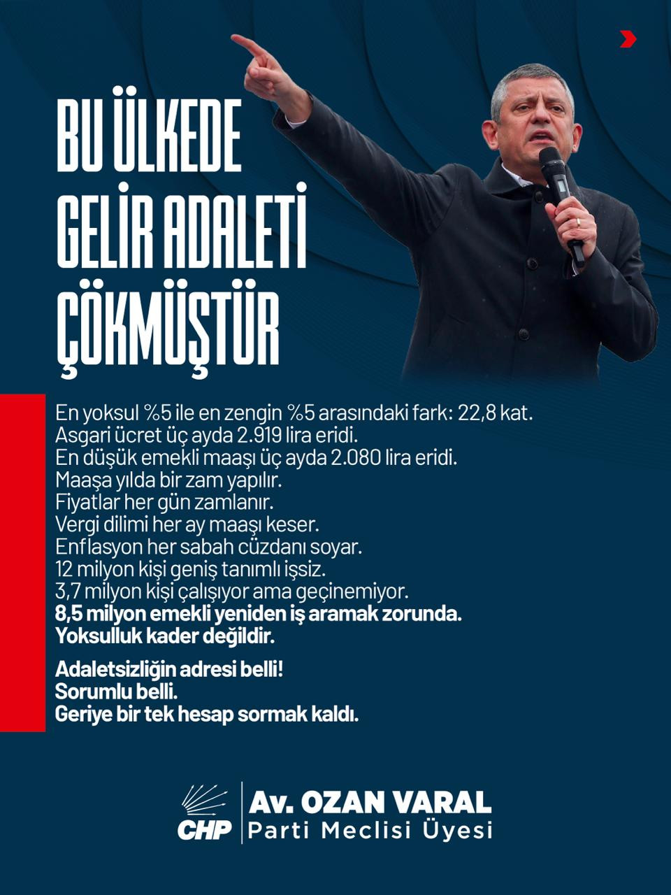 Açıklamasında Türkiye’de gelir dağılımındaki uçuruma dikkat çeken Varal, “Bu ülkede gelir adaleti çökmüştür. En yoksul yüzde 5 ile en zengin yüzde 5 arasındaki fark: 22,8 kat. Asgari ücret üç ayda 2 Bin 919 lira eridi. En düşük emekli maaşı üç ayda 2 Bin 80 lira eridi. Maaşa yılda bir zam yapılır. Fiyatlar her gün zamlanır. Vergi dilimi her ay maaşı keser. Enflasyon her sabah cüzdanı soyar. 12 milyon kişi geniş tanımlı işsiz. 3,7 milyon kişi çalışıyor ama geçinemiyor. 8,5 milyon emekli yeniden iş aramak zorunda. Yoksulluk kader değildir. Adaletsizliğin adresi belli. Sorumlu belli. Geriye bir tek hesap sormak kaldı.” dedi.