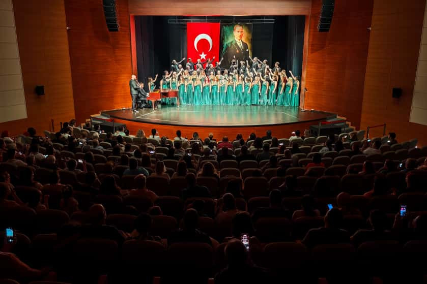 Şef Mehmet Erkoç yönetimindeki koro, Cumhuriyet’in 102. yılına özel olarak hazırladığı repertuvarla Mersinlilere hem duygusal hem de coşkulu bir gece yaşattı.