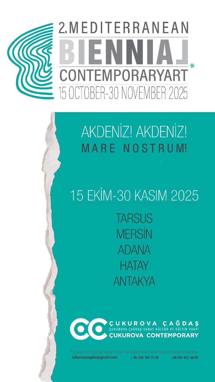 Çukurova Çağdaş Sanat, Kültür ve Eğitim Vakfı tarafından düzenlenen 2. Akdeniz Bienali / Çağdaş Sanat, 15 Ekim – 30 Kasım 2025 tarihleri arasında sanatseverlerle buluşuyor. Akdeniz’in çok katmanlı tarihsel ve kültürel mirası, bu yıl “AKDENİZ! AKDENİZ! / MARE NOSTRUM!” başlığıyla yeniden yorumlanıyor. Bienal, Tarsus, Mersin, Adana ve Hatay başta olmak üzere geniş bir coğrafyada sanatın dönüştürücü gücünü görünür kılmayı hedefliyor.