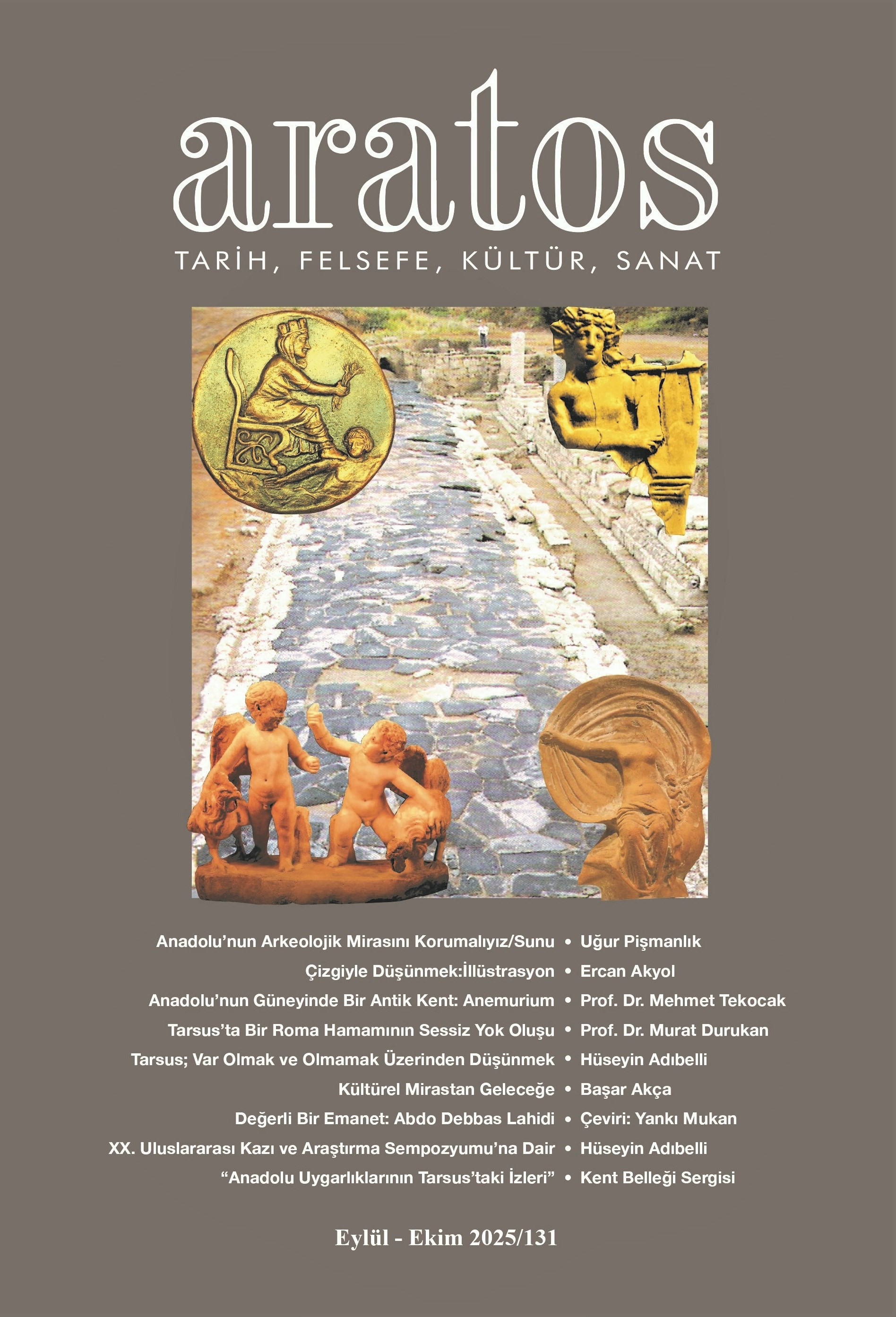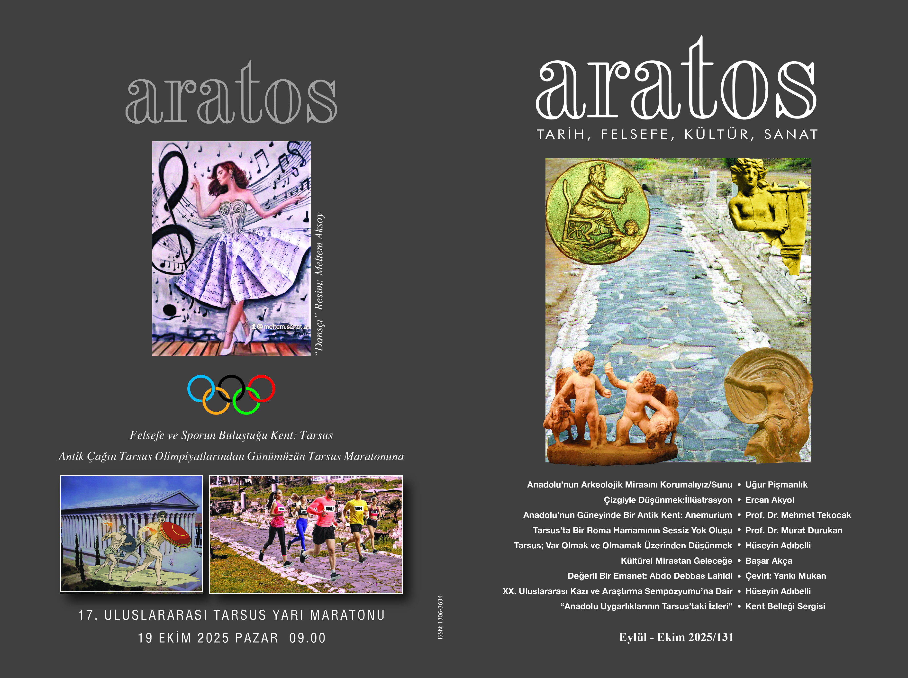 Gazeteci Uğur Pişmanlık’ın yayınladığı ve adını Antik Çağ’da yaşamış Tarsuslu filozoftan Aratos alan derginin, Eylü-Ekim 2025 131. sayısının konu ve yazarları şöyle: Anadolu Arkeoloji Mirasının Korunması Tarihsel Sorumluluğumuzdur/Sunu (Uğur Pişmanlık), Çizgiyle Düşünmek/İllüstrasyon (Ercan Akyol), Anadolu’nun Güneyinde Görkemli Bir Antik Kent: Anemurium (Prof. Dr. Mehmet Tekocak), Tarsus’ta Kültürel Mirasın Korunamamasına Dair Bir Vaka Analizi: Bir Roma Hamamının Sessiz Yok Oluşu (Murat Durukan), Tarsus; Var Olmak ve Olmamak Meselesi Üzerinden Tarihi Bir Şehri Düşünmek (Hüseyin Adıbelli), Kültürel Mirastan Geleceğe (Başar Akça), Değerli Bir Emanet: Abdo Debbas Lahidi (Çeviri: Yankı Mukan), Kent Belleği: XX. Uluslararası Kazı, Araştırma ve Arkeometri Sempozyumu’na Dair (Hüseyin Adıbelli), “Anadolu Uygarlıklarının Tarsus’taki İzleri Sergisi” Kent Arkeolojisi ve Belleğine Katkı
