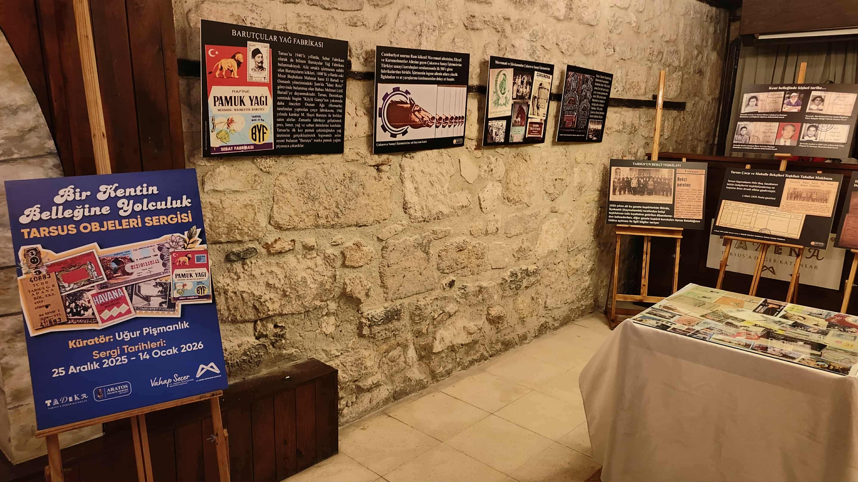 Aratos dergisi ve Tadeka işbirliğiyle açılan ol kratörlüğünü gazeteci Uğur Pişmanlık’ın yaptığı ”Bir kentin belleğine yolculuk/Tarsus Objeleri” sergisinde Tarsus’a ait PTT Posta pulları, Tarsus’ta iki önemli yapıya dair Milli Piyango biletleri, Tarsus İdman Yurdu’na ait çeşitli objeler, Karam Yağ fabrikası, Barutçular yağ fabrikası, Çukurova Fabrikası, Tarsus Maratonu, Çıplak mahallesi mührü, Tarsus’la ilgili takvimler, Tarsuslu türkücülerin plaklarından örnekler ile çok sayıda çeşitli kimlik ve belgelerden oluşan objeler yer alıyor.