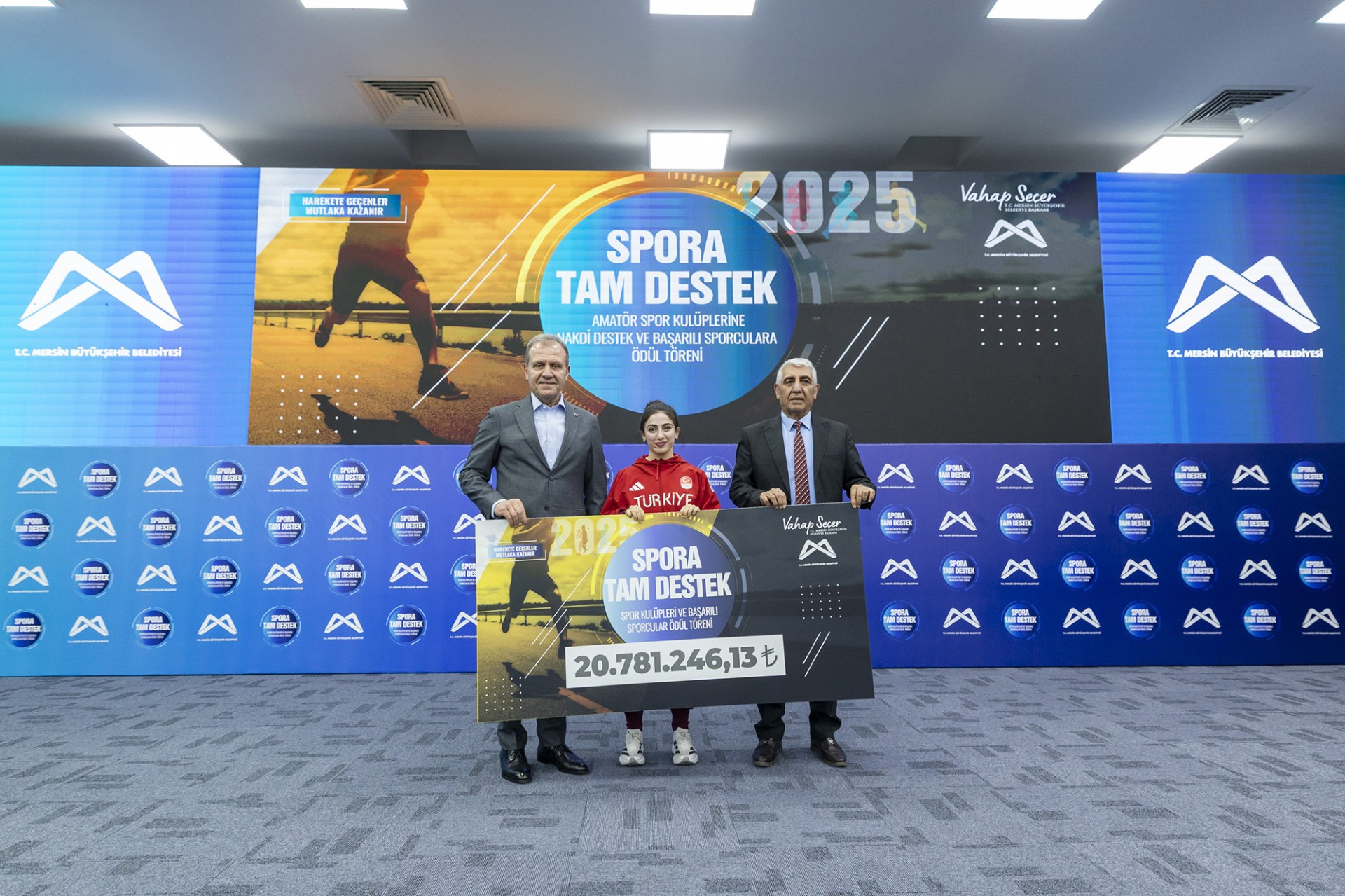 Büyükşehir tarafından, düzenlenen tören ile başarılı sporcu ve antrenörlere verilen destek kapsamında toplam 294 sporcu ve antrenöre 5 milyon 399 bin 346 TL destek verildi. Törende ayrıca amatör spor kulüplerine nakdi destek kapsamında 260 spor kulübüne 15 milyon 381 bin 900 TL destek verildi. Mersin Büyükşehir, 2 kalemde 294 sporcu ve antrenör ile 260 kulübe toplam 20 milyon 781 bin 246 TL destek vermiş oldu. Hem faal spor kulüplerine hem de başarılı sporcu ve antrenörlerine olmak üzere ikisine birden düzenli olarak maddi destek veren tek belediye olan Mersin Büyükşehir, sporun birleştirici ve toplumdaki dönüştürücü gücü doğrultusunda, sporu sosyal bir politika olarak görüp, her çocuğun güvenli, sağlıklı ve umut dolu bir geleceğe adım atmasını sağlıyor.