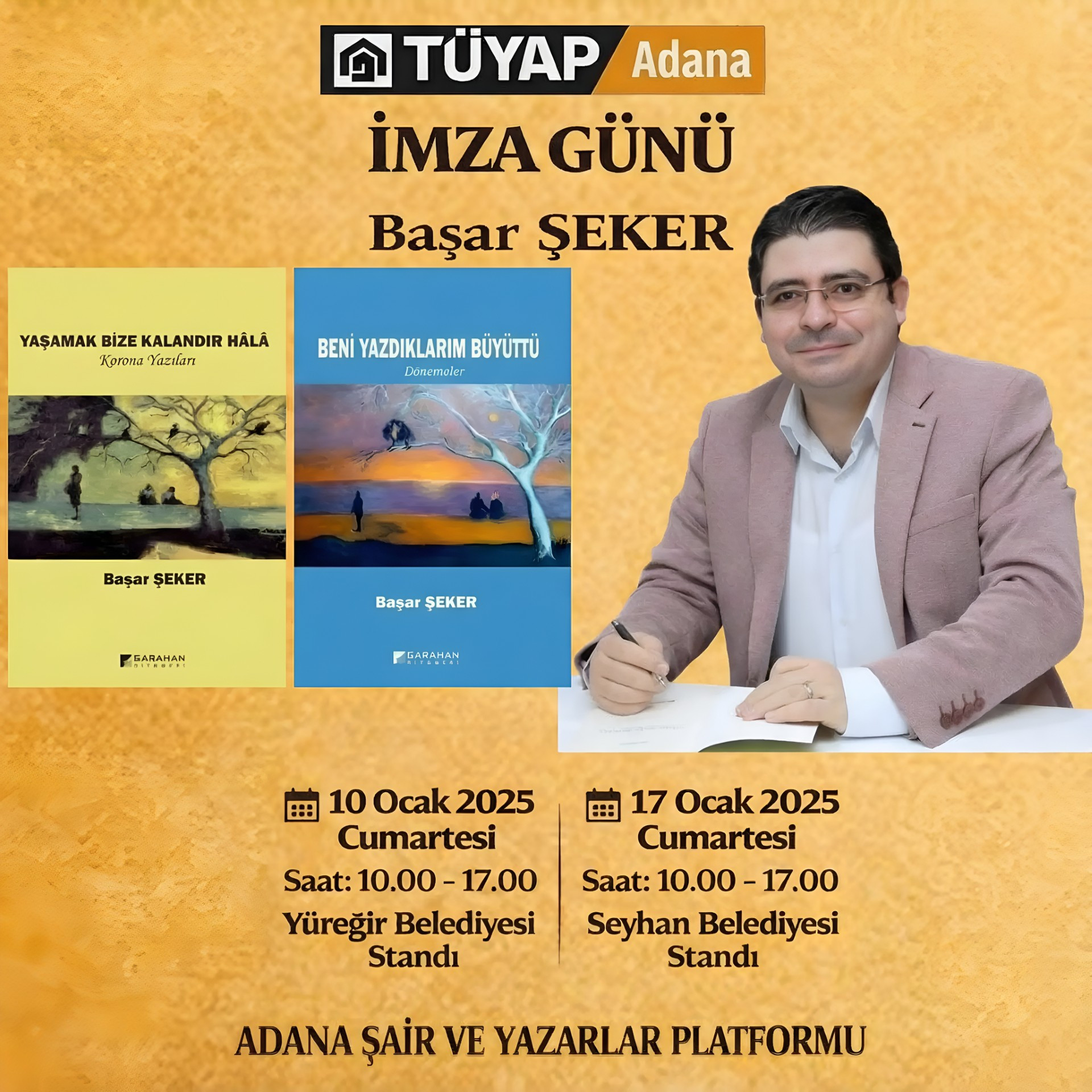 Başar Şeker, “Yaşamak Bize Kalandır Hâlâ” ve “Beni Yazdıklarım Büyüttü” adlı kitaplarını TÜYAP 18. Çukurova Kitap Fuarı kapsamında iki ayrı imza günü etkinliğinde okurları için imzalayacak.